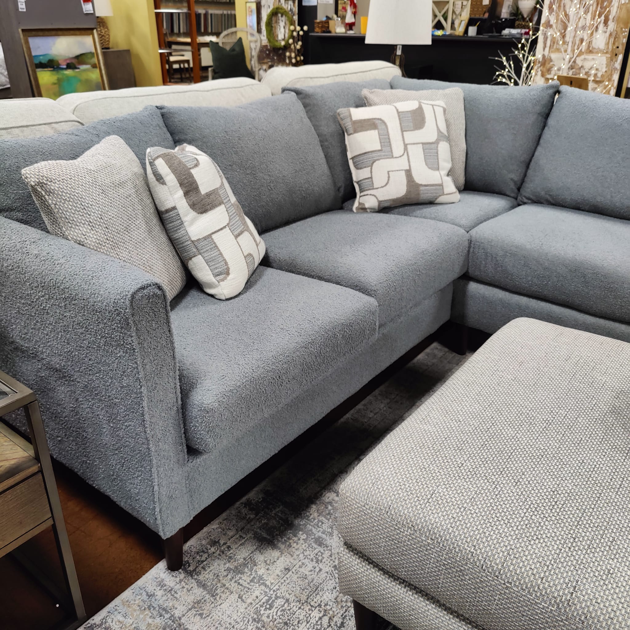 We chose the Alexvale Kylie Sectional to have a fantastic blue boucle type fabric on it and it is oh so soft and cozy! Perfect for a modern comfy set up in your living room!